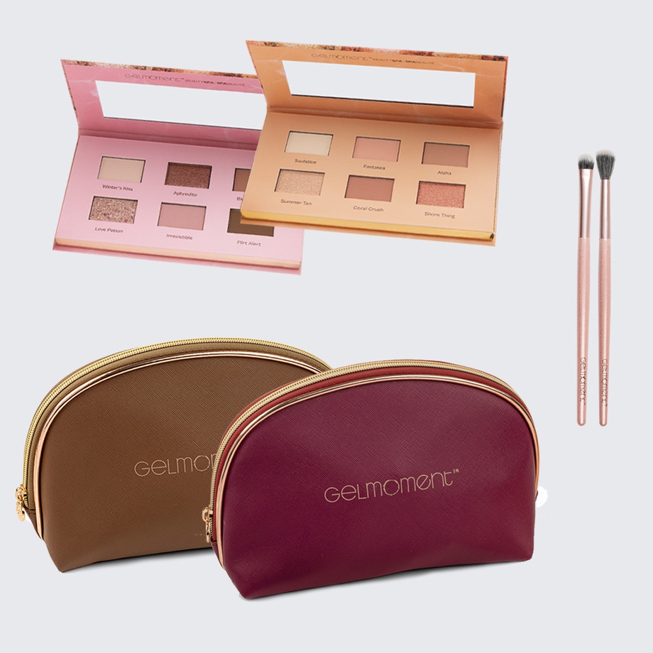 Bundle includes 1 TOUJOURS Eyeshadow Palette (choice of Pink or Peach), 1 Eyeshadow Brush Set and 1 Cosmetic Bag (choice of Burgundy or Brown). Available while cosmetic bag supplies last.